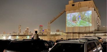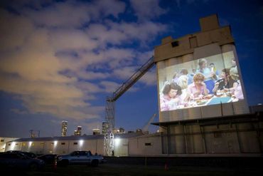 The movie will be projected onto an almost 100-foot "screen" along the side of the silos at Sawyer Yards. Movie audio will be broadcast through the FM transmitter radio in your vehicle. You are welcome to bring your own food, but Sawyer Yards is also are offering food and beverage through a contactless system with a designated pickup point. Restrooms are located to the right of the cinema screen and will be regularly sanitized.